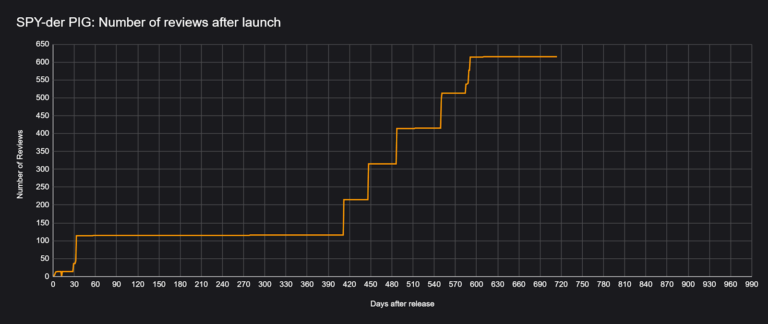这类游戏的典型特征是,发售初期评测数几乎零增长,陷入长期停滞,而某一个单一事件的发生,会让其评测数瞬间暴涨。这也是所有发售失利的开发者最期待的结果:“或许某天,有人会发现我这款被埋没的宝藏游戏。”