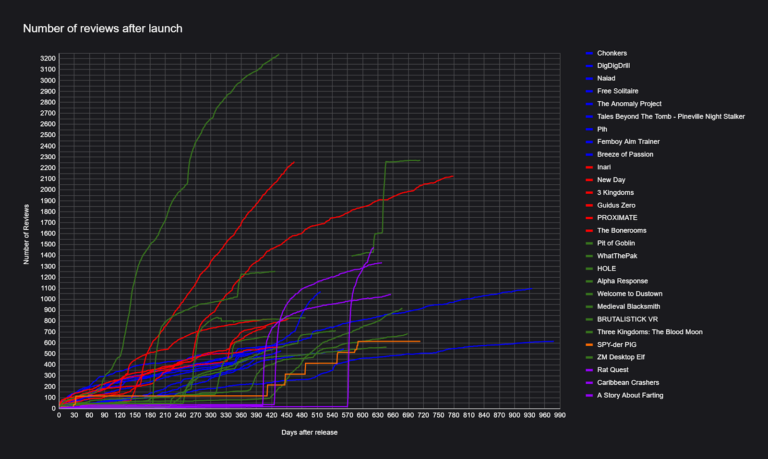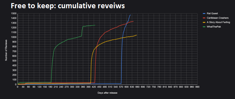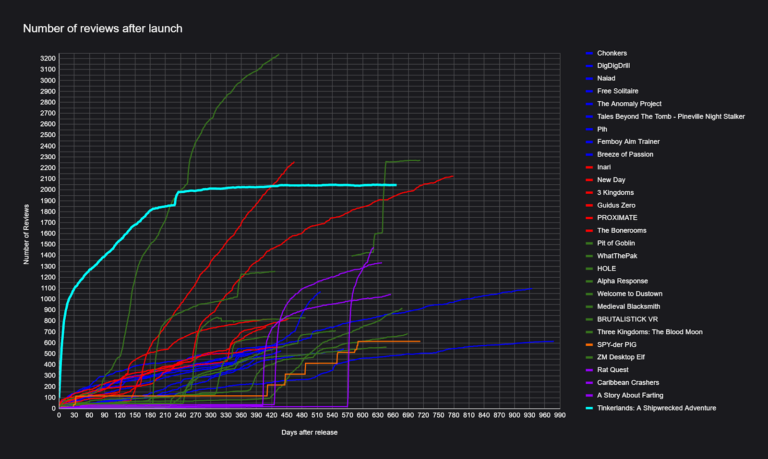 为了形成对比,我选取了一款以常规速度达到千条评测的成功游戏 ——《Tinkerlands: A Shipwrecked Adventure》。这款游戏算是爆款,但并非现象级的病毒式爆款,在图表中以醒目的青蓝色线条呈现。