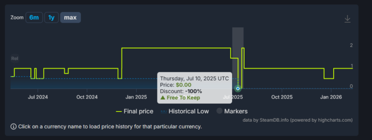 以《Caribbean Crashers》为例,其 SteamDB 价格历史图表显示,该游戏在 2025 年 7 月开启了为期一周的 100% 折扣(即免费)。