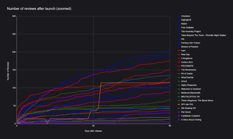 我制作了一份包含所有这些游戏的评测数据总图,但内容过于繁杂,因此我截取了上线前 60 天的数据分析图。可以看到,这些游戏在上线 30 天时,评测数均未突破 150 条;即便是上线 2 个月时,也仅有 1 款游戏的评测数超过 200 条。