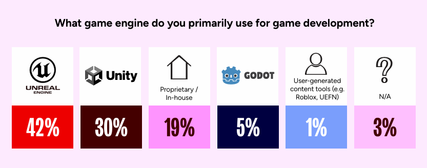 2026 年,游戏行业的引擎与平台格局迎来关键变化,实用主义成为从业者决策的核心准则,技术选择与工作室规模、项目定位的绑定愈发紧密。引擎领域,Unreal Engine 以 42% 的使用率首次超越 Unity(30%),打破了此前多年的双雄并立格局。这种格局变化并非均匀分布,而是呈现明显的场景分化:AA 工作室(59%)、AAA 工作室(47%)和新兴独立工作室(41%)更偏好 Unreal Engine,而成立 5 年以上的独立工作室仍以 Unity 为主(54%);免费游戏开发者使用 Unity 的比例(38%)高于付费游戏开发者(28%)。Godot 引擎在新兴独立开发者中获得一定突破(11%),但在成熟工作室中渗透率较低,尚未形成规模化竞争力。