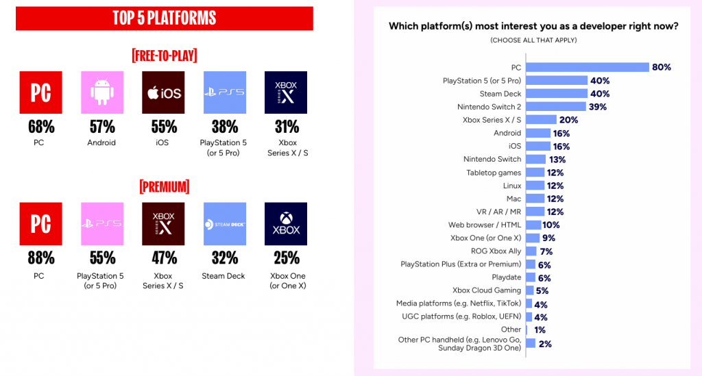 新兴平台中,Valve 的 Steam Deck 表现亮眼,作为 2026 年新增的调研选项,28% 的开发者已在为其开发或优化游戏,40% 的开发者表示有兴趣为其开发,热度与新款 Nintendo Switch 2(39%)不相上下。而其他 PC 手持设备如 ROG Xbox Ally 等,开发者兴趣度仅为 7% 和 6%,尚未形成气候。从游戏类型来看,免费游戏的主要开发平台为 PC(68%)、Android(57%)、iOS(55%),付费游戏则集中在 PC(88%)、PS5(55%)、Xbox Series X/S(47%)和 Steam Deck(32%)。