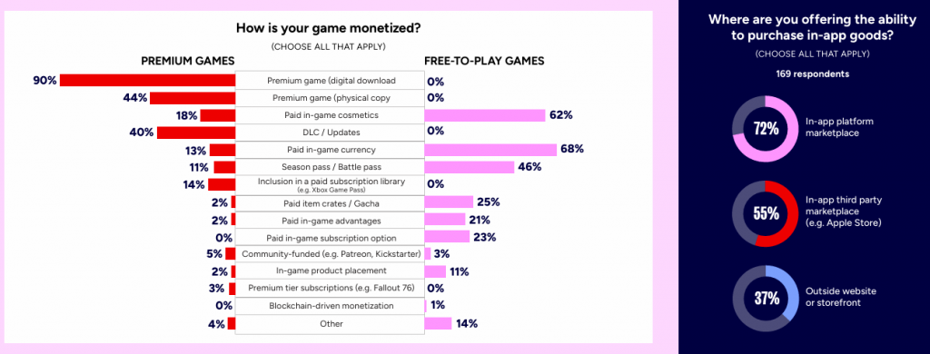 变现模式呈现鲜明的类型分化:付费游戏的主要变现方式为数字下载(90%)、实体拷贝(44%)、DLC / 更新(40%)和付费外观(18%);免费游戏则以付费游戏内货币(68%)、付费外观(62%)、赛季通行证(46%)和付费宝箱 /“扭蛋” 机制(25%) 为主。区块链驱动的变现模式仍处于边缘状态,仅 0.4% 的受访者使用,且主要集中在免费游戏。