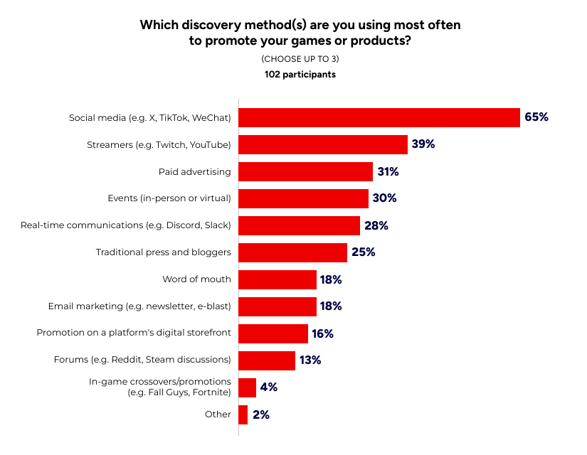营销渠道上,社交媒体成为绝对核心,65% 的营销人员将其作为主要推广方式,其中 Instagram/Reels(66%)、TikTok(64%)、YouTube/Shorts(63%)是最受欢迎的平台。其他重要推广渠道包括主播(39%)、付费广告(31%)、线下或虚拟活动(30%)、实时通讯工具(如 Discord、Slack,28%)和传统媒体与博主(25%)(报告 P46)。游戏公司营销人员对主播的依赖度更高(49%),且实时通讯工具的使用(29%)超过了活动推广(23%)(报告 P46),反映出游戏营销向 “精准触达” 和 “社区互动” 转型的趋势。
