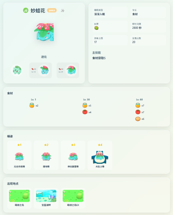 这是个为期3天的练手项目,用来记录和展示“宝可梦睡觉”中的图鉴。它包含所有宝可梦睡觉中出现的宝可梦、地图、料理、食材、技能的图鉴,能够查询并看到一些重要的详细信息。