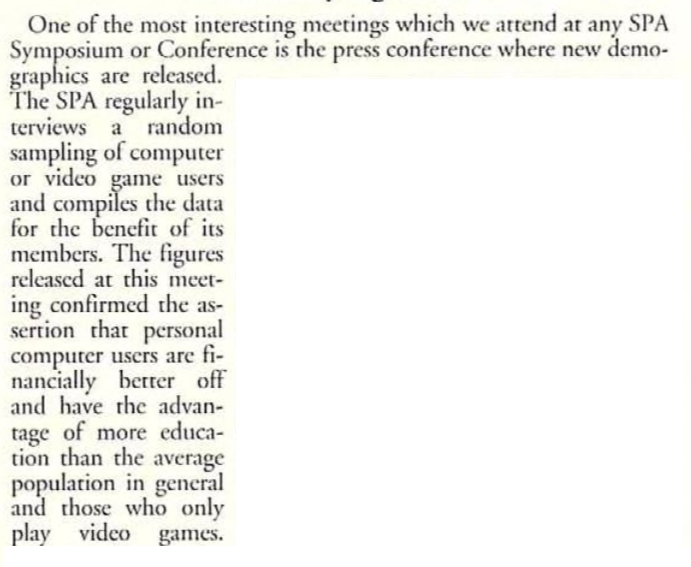 “软件与信息产业协会(SPA)定期对电脑或电子游戏用户进行随机抽样调查,并整理数据供其成员使用。在这次会议上公布的数据证实,与普通大众以及那些只玩电子游戏的人相比,个人电脑用户的经济状况更好,受教育程度也更高。”