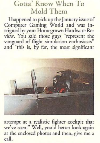 这是《电脑游戏世界》读者的一封完全严肃的来信,描述了他的游戏设备。他买了一个旧的战斗机驾驶舱,在里面安装了两台游戏电脑,还配有一个座舱盖,将他包围在一个受保护的游戏空间里。他甚至在系统里安装了电话和对讲机,这样他的妻子就可以叫他吃饭了。