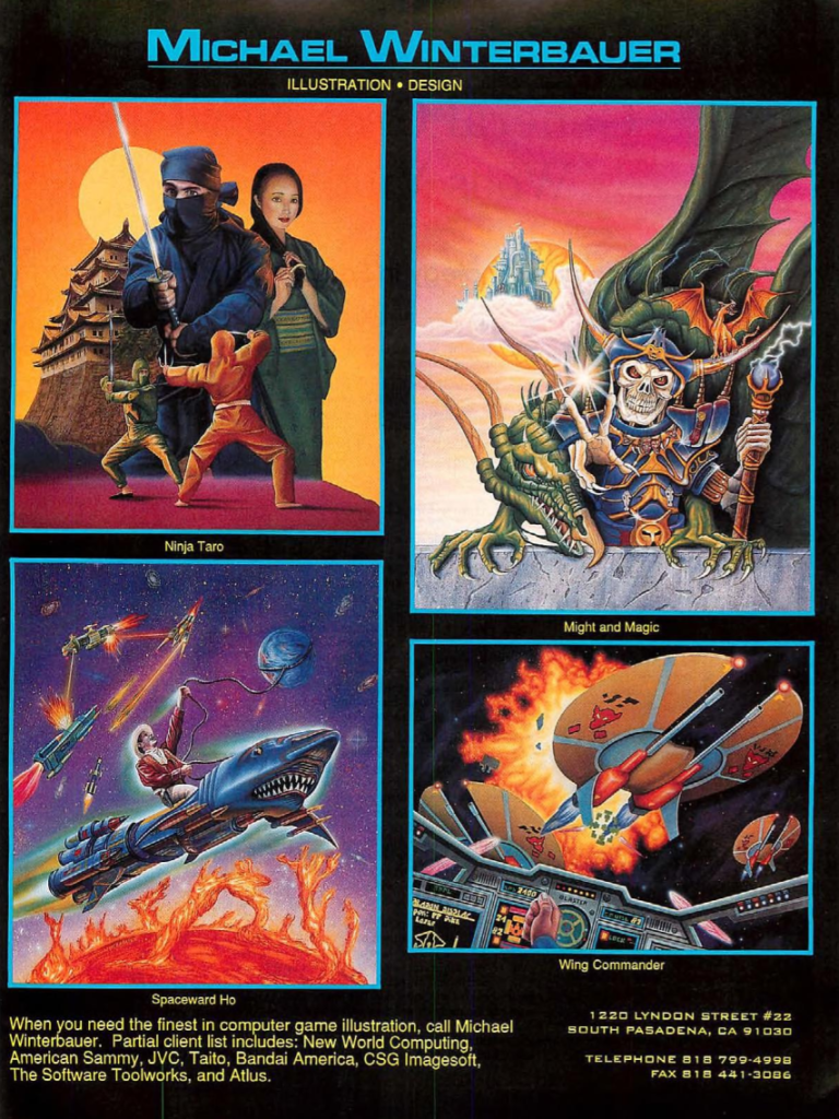 杂志中间有一整页广告,由迈克尔・温特鲍尔(Michael Winterbauer)刊登,他曾为《银河飞将》(Wing Commander)等游戏设计过令人惊叹的盒装封面。