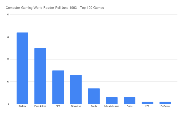 所以为了验证我的 “直觉”,我绘制了 1993 年 6 月的读者投票图表。令人惊讶的是,这个图表看起来相当 “偏向建造、策略、模拟类”,不是吗?