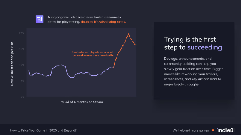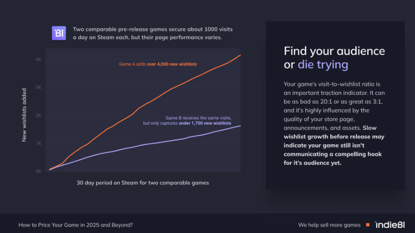 受众必须对 “在你的游戏中投入时间” 感到兴奋。如果 Steam 缩略图毫无辨识度、截图混乱难懂、预告片枯燥乏味,潜在买家可能在看到价格前就已流失。