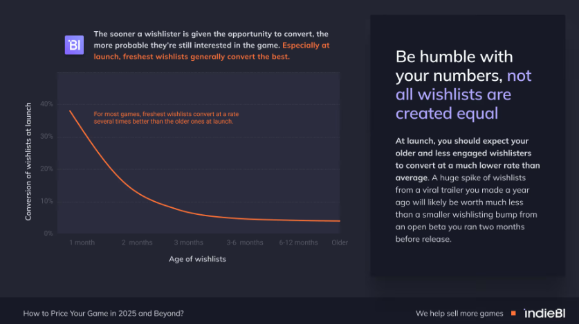6.市场热度与需求:上线前已有数万人期待你的游戏吗?这些期待是真实的吗?还是仅因一年前你的 GIF 走红,玩家添加愿望单后便再无互动?相比 “累计愿望单数量”,活跃的社区测试、长期有效的 Next Fest demo、上线前活跃的 Discord 社群,往往是更可靠的需求指标。愿望单添加时间越久,转化概率越低;与半年前 “被动添加愿望单” 的玩家相比,积极参与社区、测试游戏、提供反馈建议的玩家,在上线时购买的概率要高出一个数量级。低迷的市场热度很少能通过定价单独挽救 —— 这更可能意味着你需要推迟上线,争取更多时间寻找受众。若无法推迟、只能 “上线碰运气”,那么为一款本就缺乏热度的游戏设定高定价,多半无济于事。