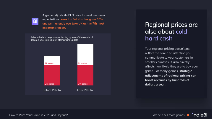 诸如 “#PolishOurPrices”(优化波兰定价)等草根倡议,正通过玩家反馈凸显这一问题;但更切实的解决方案是:优化区域定价,这是永久性提升收入的简单方法。此外,没有任何 “通用定价模板” 能考虑到你游戏的独特受众构成与策略。需由你亲自分析 “各区域愿望单占比” 与 “游戏玩法数据”,识别关键市场;由你决定 “为哪些核心区域投入资源优化商店页面本地化”;由你判断 “有意降低哪些市场的定价以提升渗透率”。定期投入时间手动评估并调整区域定价,将为收入增长与玩家满意度带来显著提升。