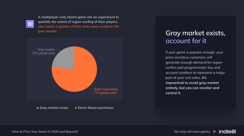 应对灰色市场:不可避免地,部分玩家会 “货比三家”,在盗版网站或第三方转售平台寻找你的游戏。若游戏足够受欢迎,专业灰色市场卖家会介入以满足需求 —— 他们可能从第三方商店批量购买激活码,或在你未提供实体零售时,购买 Steam 账号后 “以机器人脚本转售”。无论如何,这些卖家总会以 “最低可用价格” 收购你的游戏。你或许无法阻止灰色市场,但可以为团队争取更多灰色市场收入。若你认为灰色市场会对游戏造成影响,至少应将 “部分低价区域的定价” 适当提高 —— 例如,哈萨克斯坦区域定价从 2 美元升至 4 美元,卖家仍会进货,但你从灰色市场获得的收入会翻倍。