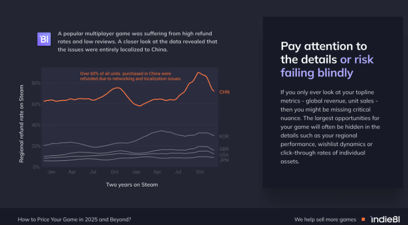 区域市场洞察:即便在上线后,密切关注区域数据也可能为游戏开拓全新市场。即便你不懂某国语言,仅通过数据也常能发现值得深入挖掘的机会。一旦确定方向,翻译退款原因与评测、研究区域论坛、询问社区成员,往往能找到 “易于解决的问题”—— 解决这些问题,就能让全新受众爱上你的游戏。