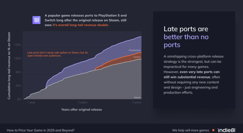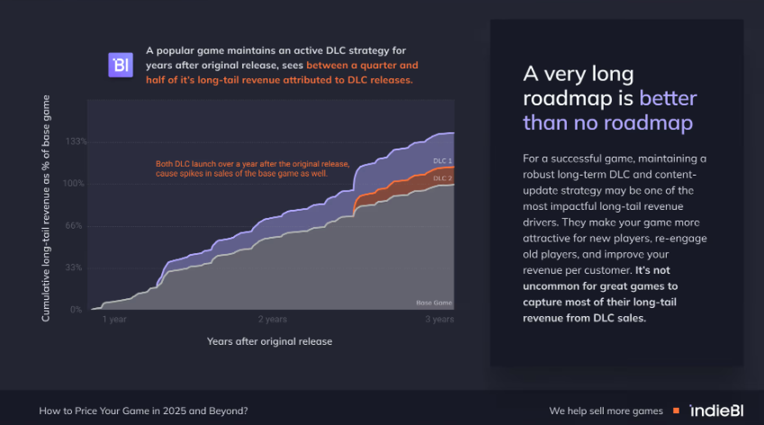 平台拓展与 DLC 规划:若你的游戏足够出色,任何时候扩大受众都不算晚。一般而言,核心内容规划越早落地越好:主机移植版若能与 PC 版同步上线,效果最佳;DLC 推出越早,产生收入的时间就越长;越快为游戏添加新内容或模组支持,转化率与销量增长就越迅速。但即便过了数年才推出移植版或 DLC,仍可能极具价值:一套优质 DLC 常能让游戏后续收入翻倍;主机移植虽成本高、技术复杂,但能显著提升 “长尾收入”,并为你当前及未来的游戏开拓全新受众。只要持续理解业务数据与受众需求,在 “平台拓展与 DLC 规划” 上做出正确决策就不会困难。