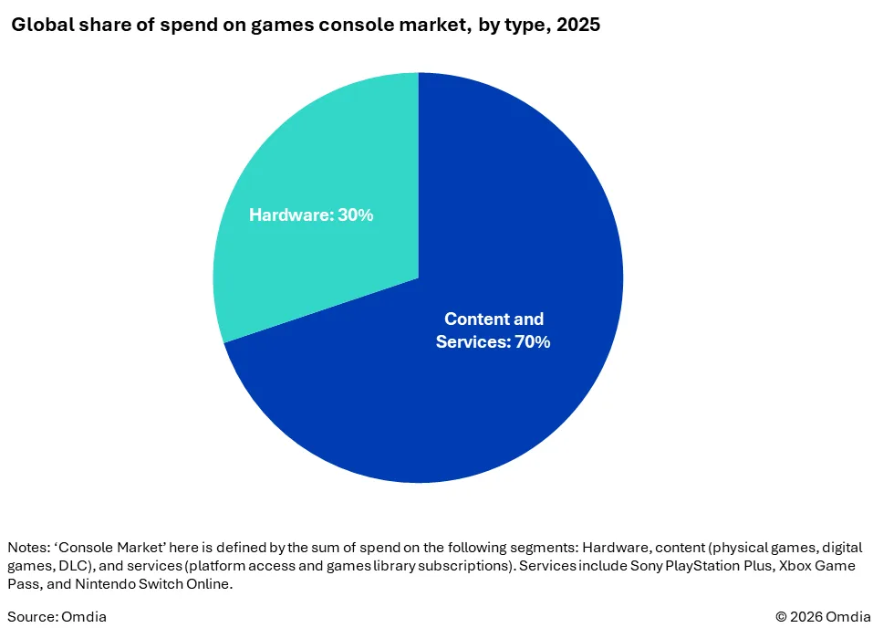 • 内容与服务:70%:本文所指主机市场,包含硬件、内容(实体游戏、数字游戏、可下载内容 DLC)、服务(平台接入权、游戏库订阅服务)三大板块消费总额;其中服务板块涵盖索尼 PlayStation Plus、微软 Xbox Game Pass、任天堂 Nintendo Switch Online。数据来源:Omdia