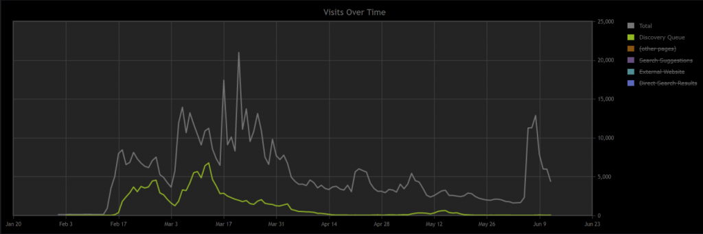 主播们带来的大量流量,触发了 Steam 平台的 “探索队列” 机制(Discovery Queue,下图中绿色线条所示)。