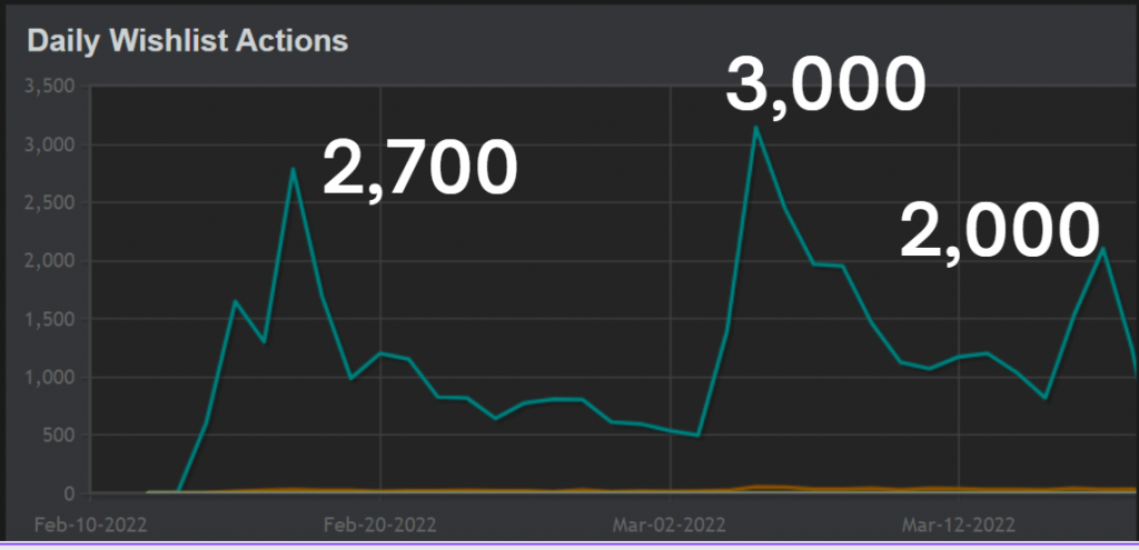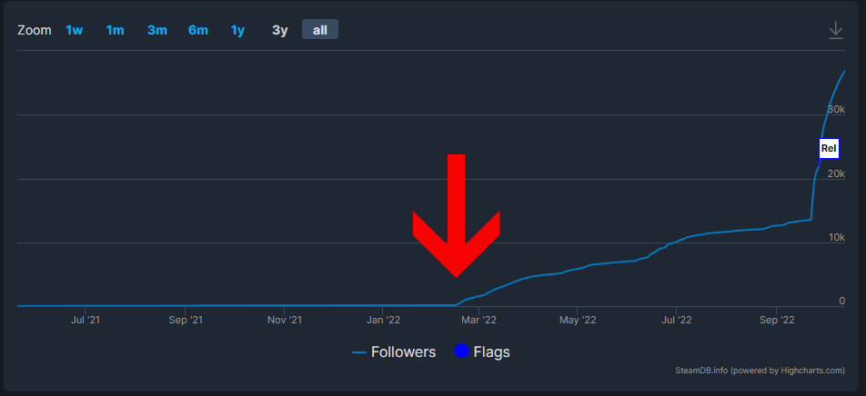 观察《穹顶守护者》的 Steam 关注者图表会发现,游戏曝光度和愿望单数量的转折点,正是 2022 年 2 月 14 日试玩版发布的那一刻。