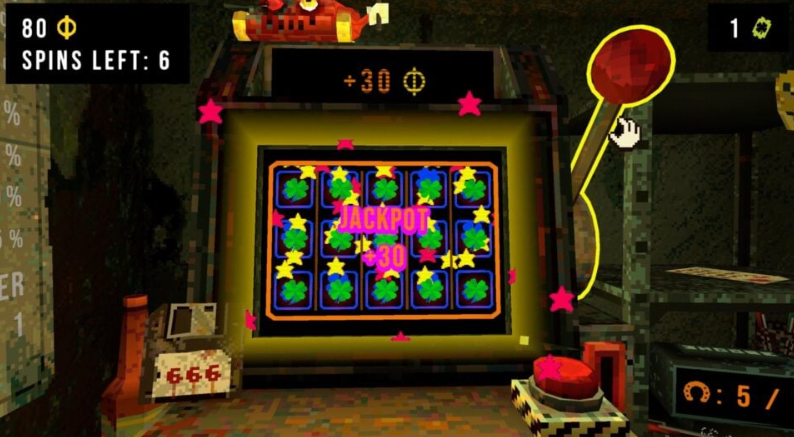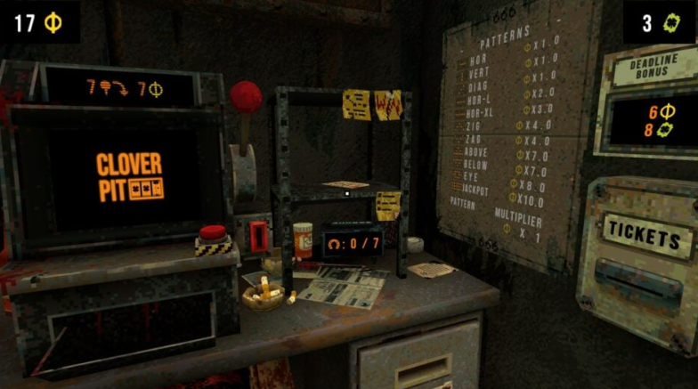 老虎机本质上带着一种悲凉感。首先,它是最残酷的赌博形式:全程与技巧无关,因为每一台机器都经过预设 —— 何时吐钱由程序决定,而其设计初衷就是 “吞入的钱永远远多于吐出的钱”。更具讽刺意味的是,老虎机往往披着明快欢乐的外衣:彩色水果与宝石图案不断转动,上百盏彩灯以诱人的模式闪烁,可这一切设计的目的,都是为了掏空你的钱包。《四叶草深渊》恰恰扎根于这种矛盾之中:它将旋转的水果与珍宝图案置于一台破旧的机器上,机器一角还赫然印着令人不安的血迹,而整台机器又被安置在一间狭小肮脏、如同牢房般的房间里。更关键的是:如果赢不到足够的钱,你就会丧命。