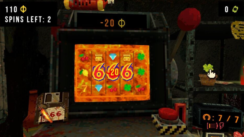 游戏的所有流程都透着一股恶魔般的诡异感。其粗糙的像素画风让人联想到 2021 年的恐怖卡牌游戏《密教模拟器》(Inscryption)—— 两款游戏甚至可以打包购买;此外,还有一位带字幕的旁白,以嘲讽的语气向你解释当前的困境。你需要在老虎机的三轮游戏内赚够固定数量的硬币,若未能达标,脚下的地面就会裂开,你将坠入深渊而亡。若成功过关,下一个 “最终期限”(Deadline)的目标金额会提升,同时开启新的三轮挑战。