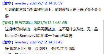 其中参数List<GameObject> cha就是这一帧进入这个范围的角色们(的GameObject),而在此时,aoe的AoeState.characterInRange中还没有这些角色。当每次范围内的角色离开范围后再次进入范围,就会再次执行这个。所以假如我们需要做一个效果是“对进入范围的目标造成50点伤害,但是短时间内不会再次伤害”,遇到有角色在这个AoE范围里“我出来了,我又进来了,我出来了,我又进来了”,就需要通过buff来辅助,其执行的函数是——没有某个buff的时候会造成伤害并添加buff,持续时间为这句说明中的“短时间”,否则return。当然我们也可以利用AoeState.param来做类似bullet.hitRecord的事情,比如param[“hitRecord”]=new List<hitRecord>(),然后通过OnTick事件来维护这个List也是一个做法,只是相比之下,上一个buff的性能会好不少,但是如果太多这样的类似效果的话,我们就不得不审视这个项目是否需要一个aoeHitRecord了(做法是活得,而不是因为框架如此就动不得了)。