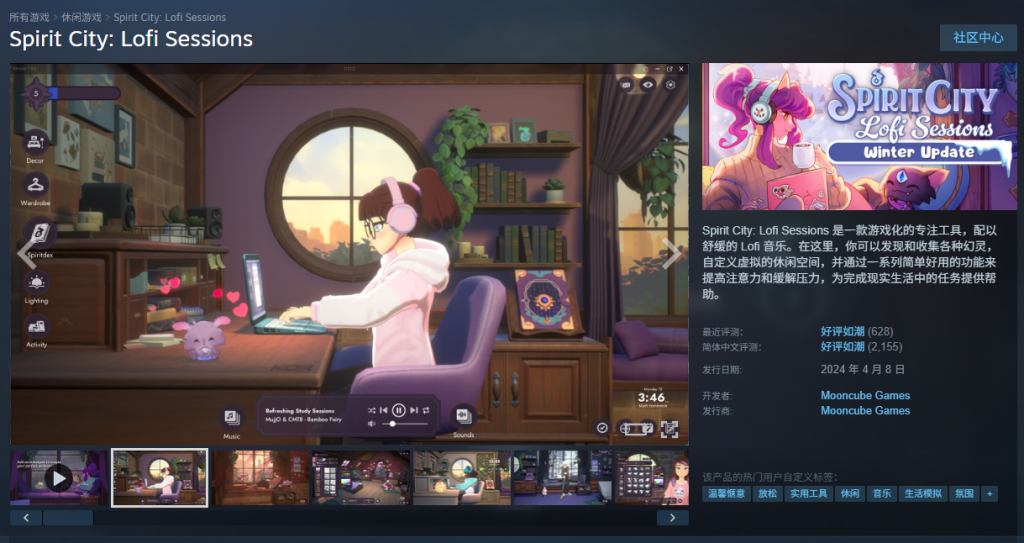 Spirit City: Lofi Sessions是一款非常特别的游戏,或者我们把它称之为工具更合适。它的成功令人瞩目,而它所属的类型或许是许多独立游戏开发者都未曾听闻的:效率型放置游戏 / 房间装饰游戏 / 宠物收集游戏。通俗地说,它是一款融合了番茄钟计时器、《点点饼干》式点击玩法、《模拟人生》风格与《宝可梦》收集元素的作品。或许很多人已经在用它来督促自己专注任务了。