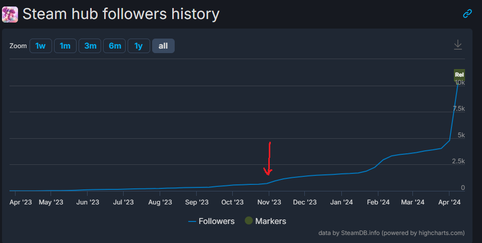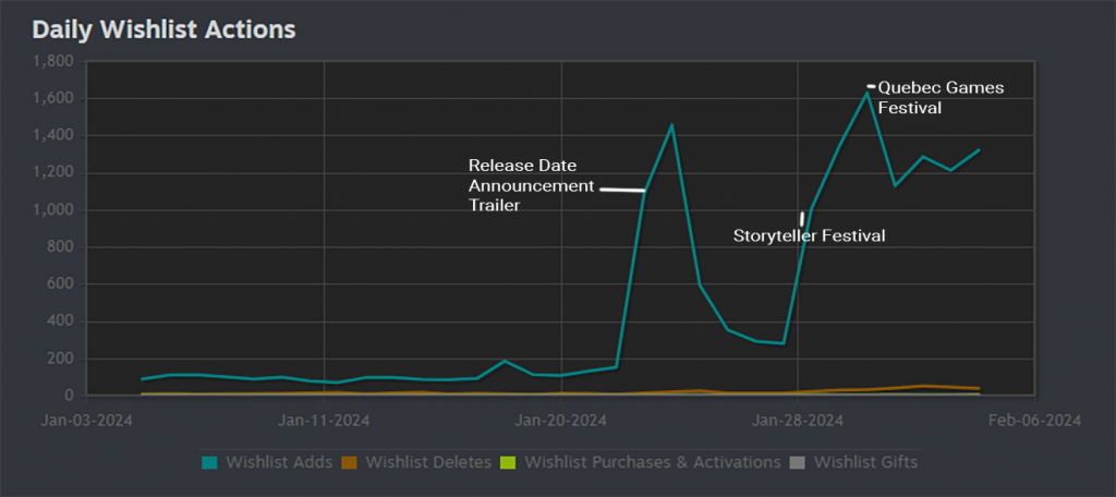 最终,他们参加了 2 月的新品节,并取得了巨大成功:“新品节期间,我们新增了 15204 个愿望单。尽管最后两天的促销访问量不算高,但探索队列(Discovery Queue)帮我们弥补了这一缺口 —— 昨天通过探索队列获得的访问量甚至超过了促销活动!希望探索队列能继续为我们带来曝光…… 两周前我们也做了一次大规模推广:发布了新预告片、公布了发售日期,还与温馨向游戏领域的网红博主展开了合作。”