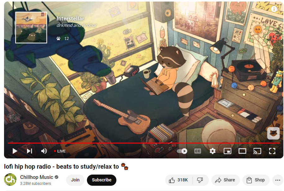 不妨看看这些舒缓类视频频道的缩略图,再对比我截取的《Spirit City: Lofi Sessions》游戏画面 ——YouTube 上的 “舒缓高效” 子类别内容,都有着 “可爱生物 + 房间美学” 的鲜明特征,而《Spirit City: Lofi Sessions》完美捕捉到了这一点。